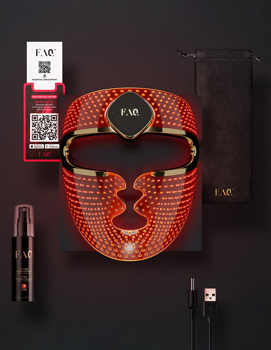 1. Limpia y seca tu rostro, y aplica la base FAQβ’ si lo deseas. A continuaciΓ³n, coloca la mascarilla LED de silicona FAQβ’ 202 sobre tu rostro, y asegΓΊrala con la cinta de cabeza.